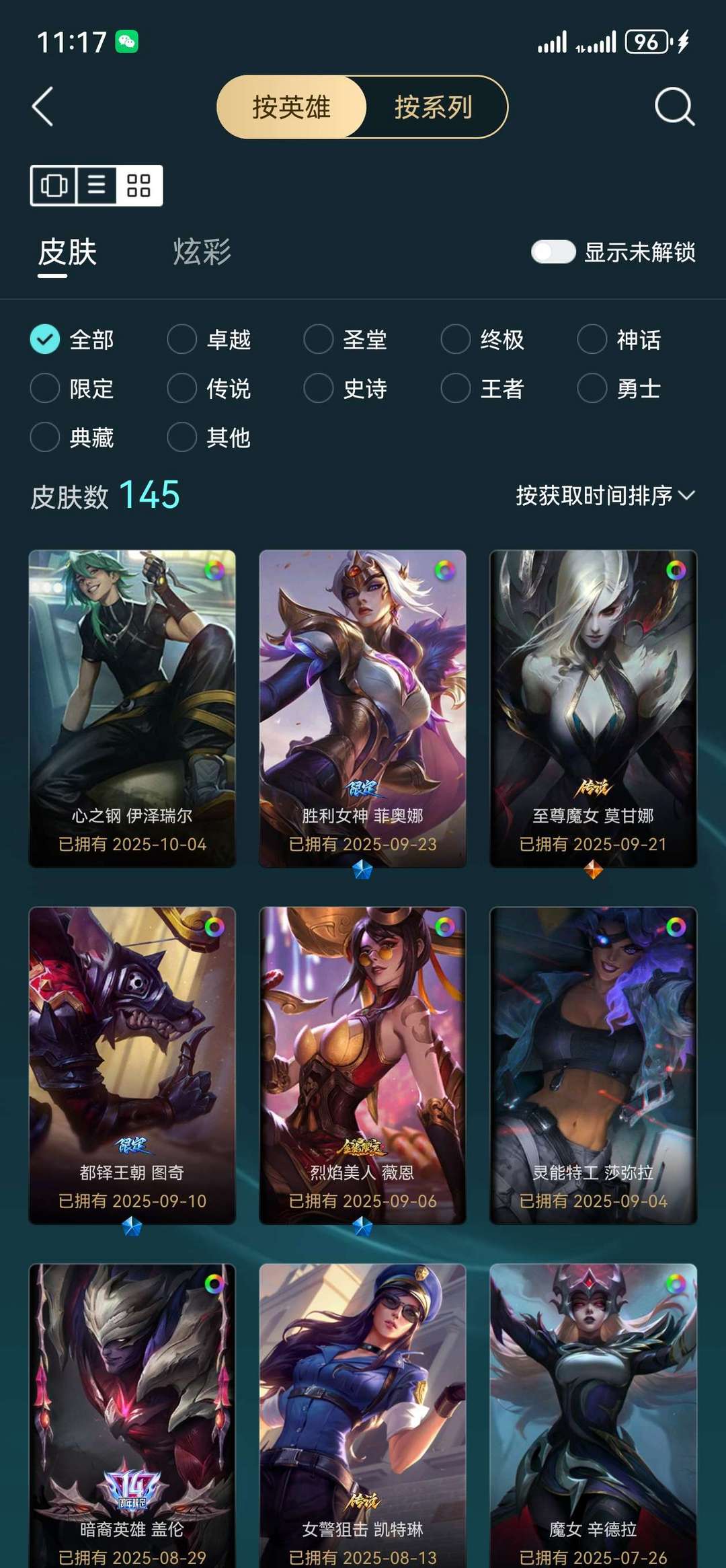 全英雄、146个皮肤、50个炫彩皮肤