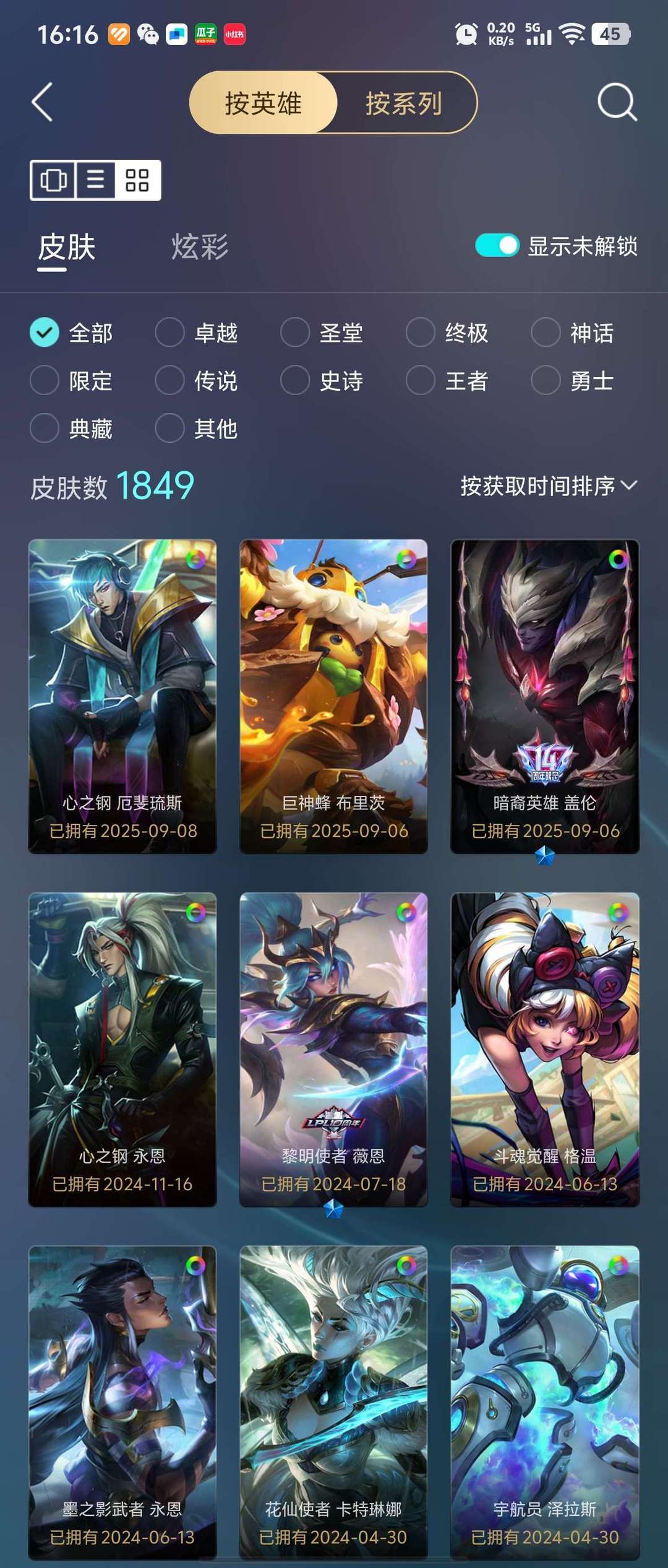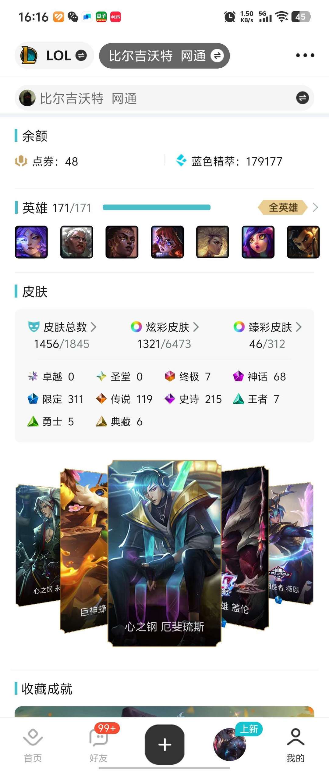 1452皮肤 1284炫彩 34臻彩 68神话/310限定/119传说/167英雄