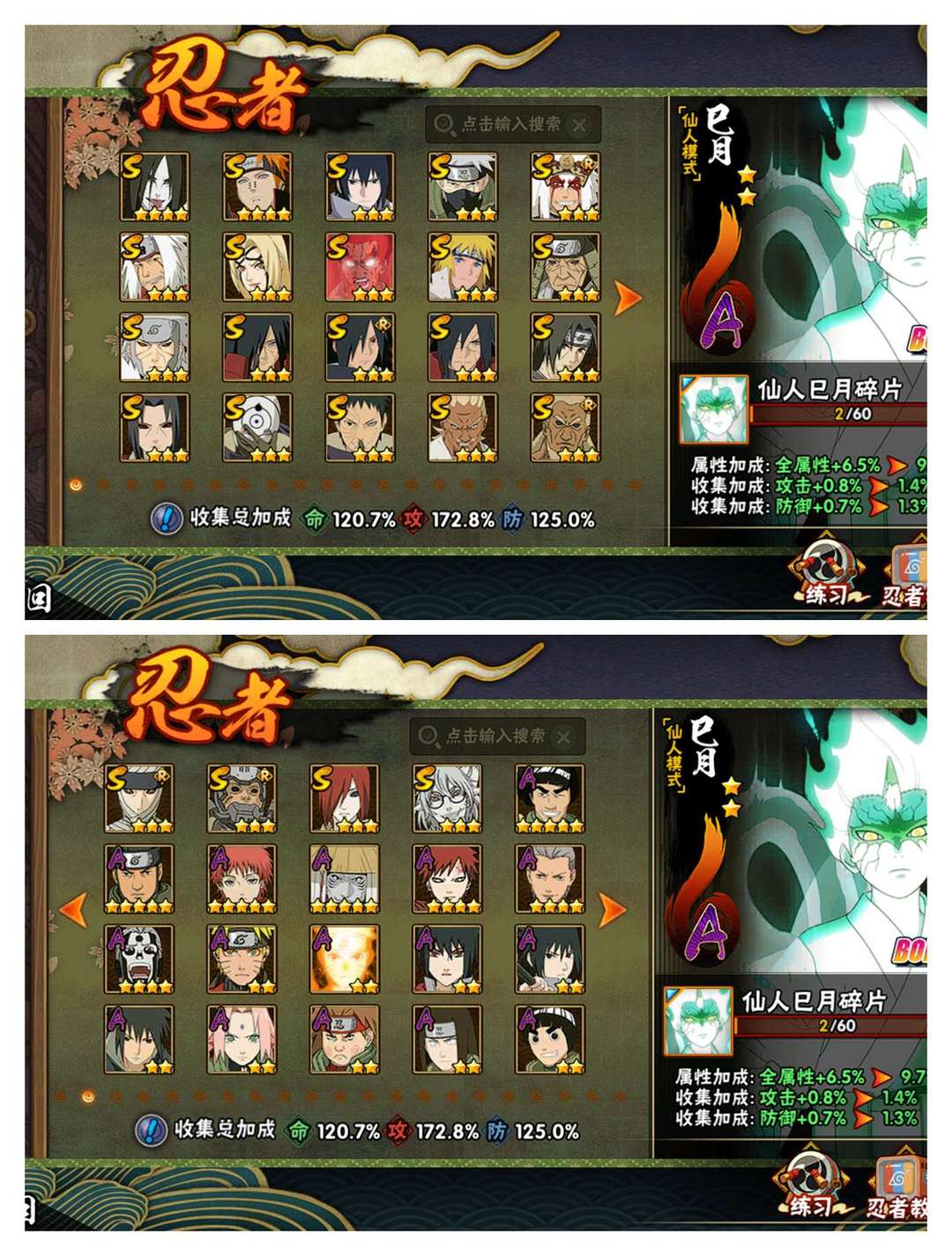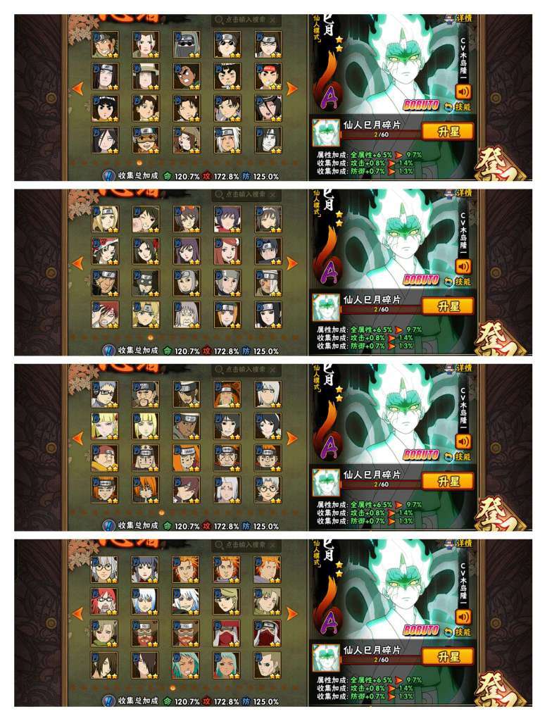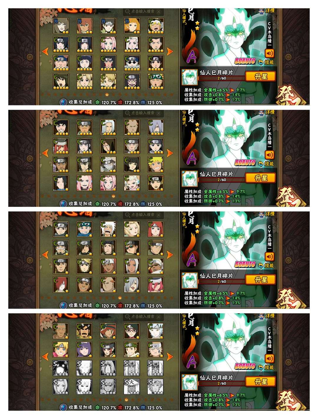 仙人巳月,妖怪纲手,须佐卡卡西,破面带土,漂泊再不斩,百豪纲手,传说自来也,秽土二代,解斑,永恒佐,死门凯,秽土鼬,秽土长门,秽土三代,忍战雷,鹰佐,骨架,青水…多数高招A千万战力有熊猫
