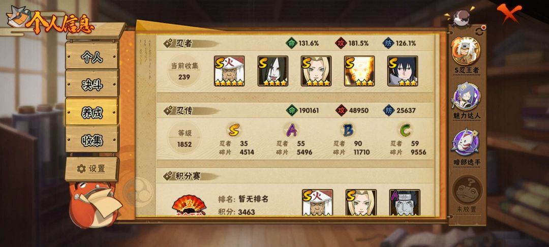 高招s,a,齐全高配号,黄猿紫狗樱帝,狂野鬼鲛,仙人自来也,老三代,秽土鼬,植物人,仙人兜,秽土班,青年水门,须佐佐助,强力忍者齐全,战力马上1900w可带团本