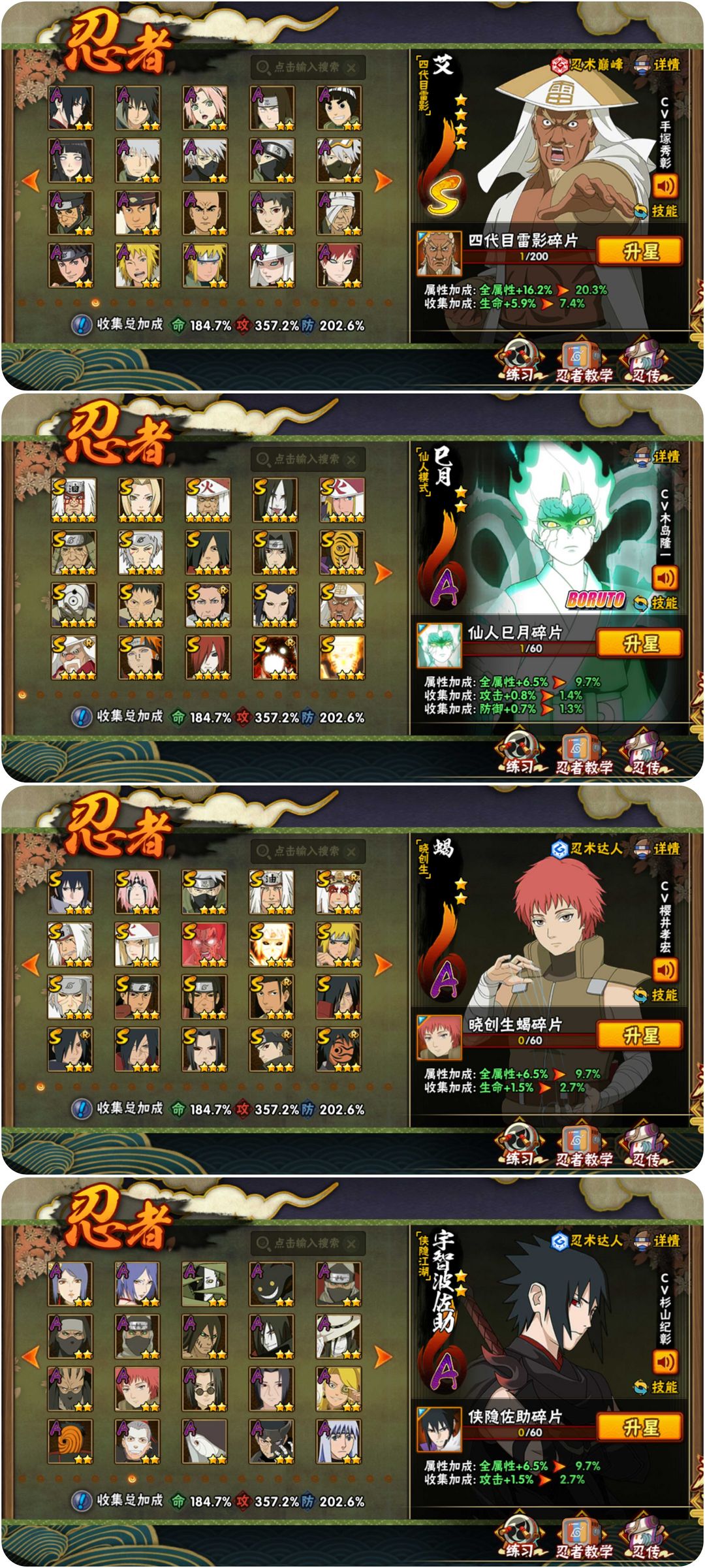 安卓忍者:390忍者全S忍 90A 忍全 B 忍 喜欢的请收藏方便下次找号,希望能给个五星好评谢 谢 温馨提示:此账号为快速上号模式登录,不需要输入 账号密码,租用后一键登录即可,如果出现登录异常 等无法登陆情况,只需先打开火影忍者到登录界面, 然后在用租号玩一键登录即可。新版本 bug:上号时 上单租客若还在线会显示在别处登录,重新上游戏即 可,不是有人挤号 安全提示:恶意撤单或者恶意投诉差评讲永久拉黑处 理,请文明游戏 小店在这祝您游戏愉快,喜欢的点击收藏↓↓记得给 小店五星好评呦