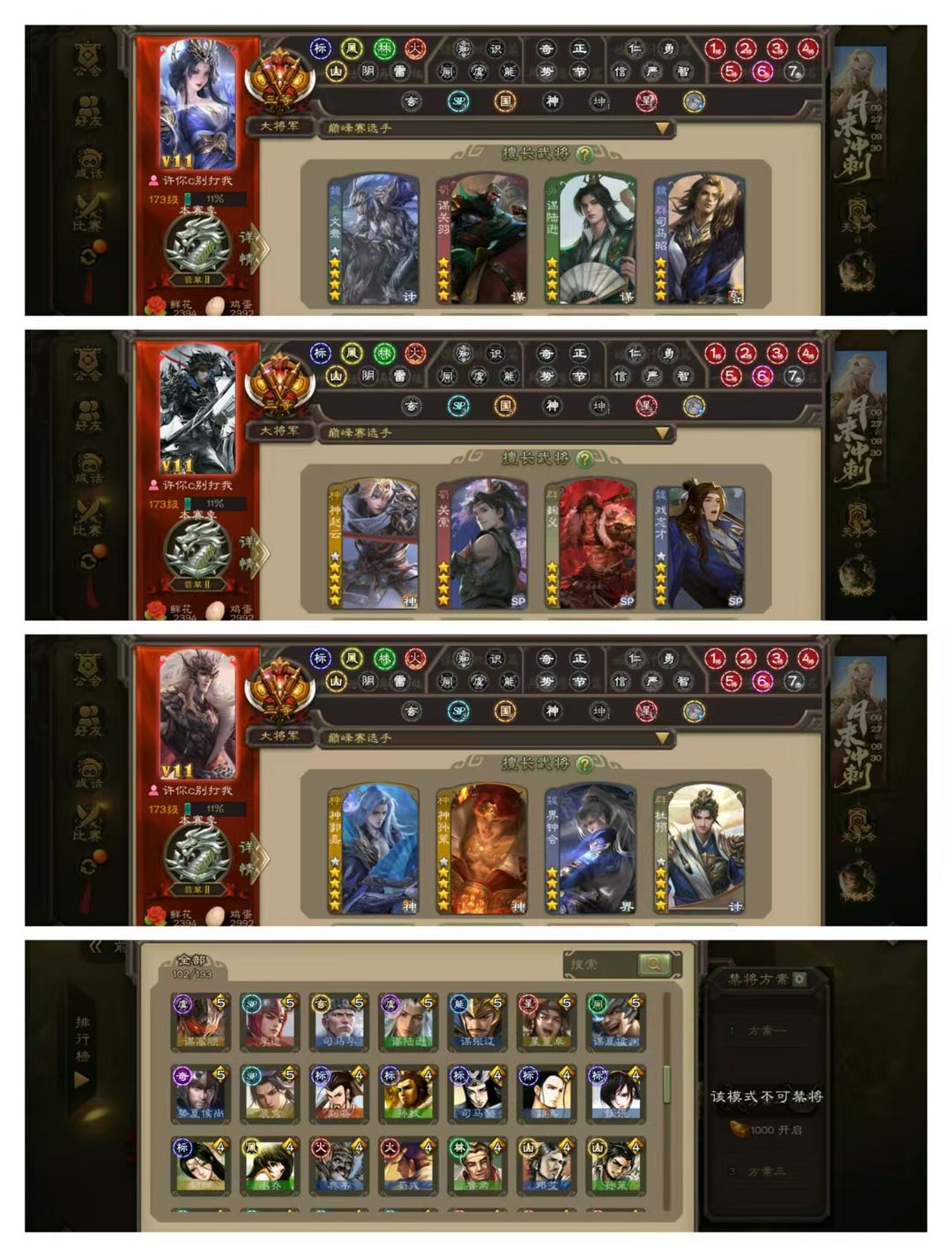 官方三等大将军,有卡,VIP11! 15四星玉龙:回廊双形态至臻动神郭嘉,回廊双形态至臻动杜预,回廊双形态至臻动界钟会,回廊动神孙策,回廊动谋关羽,回廊动文鸯,回廊动神赵云,回廊动聚义,动司马昭动谋陆逊,势陆郁生曹髦张奋裴秀! 37史诗武将:动清河公主动神陆逊,鲍信谋黄月英司马孚! 102排位武将,35动皮80金皮160国战皮肤!