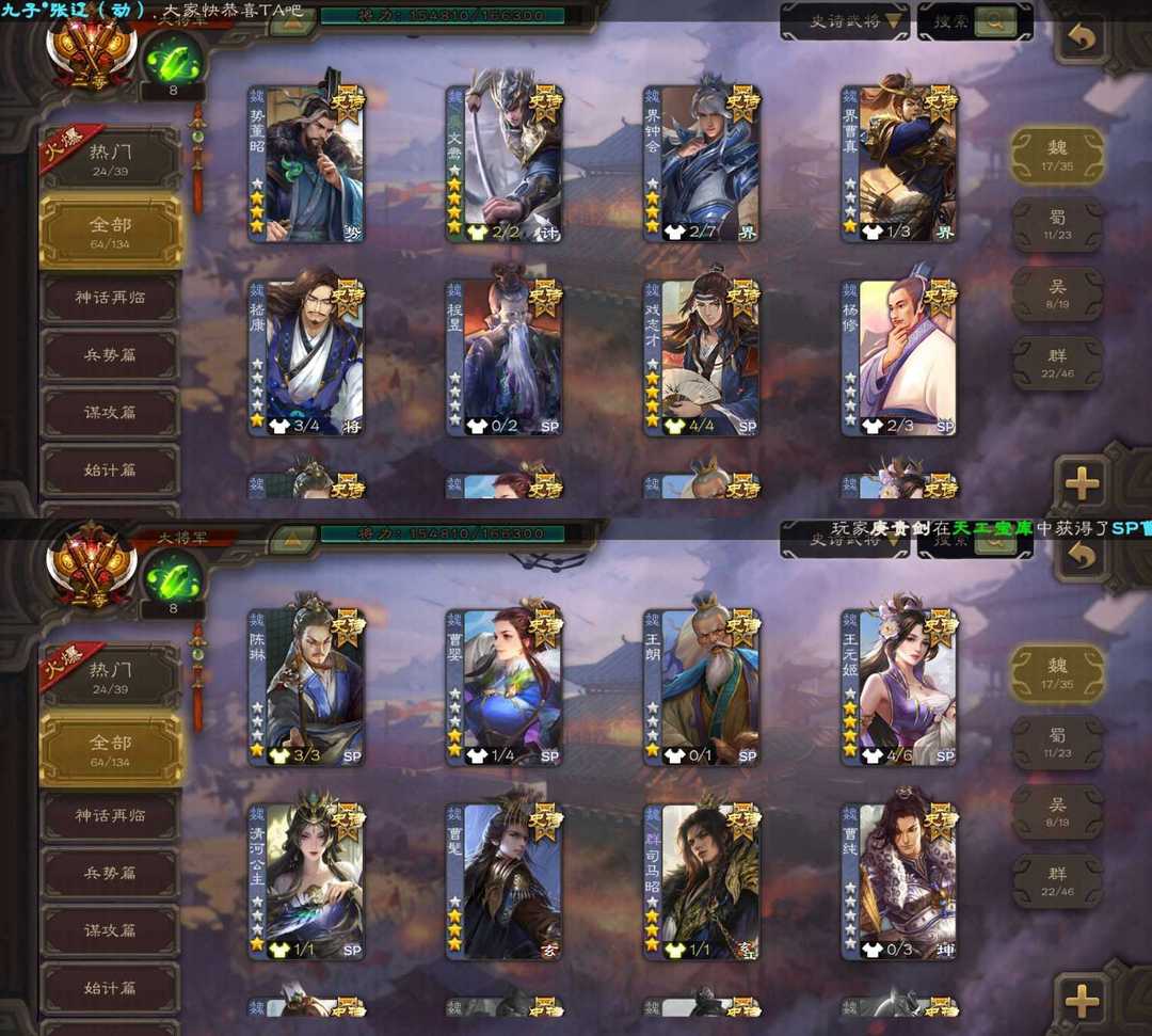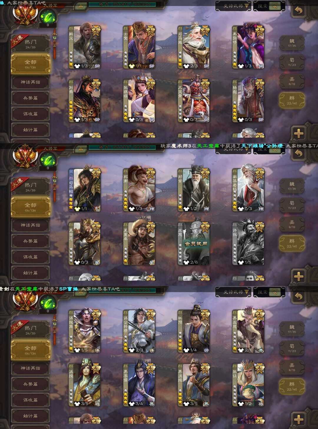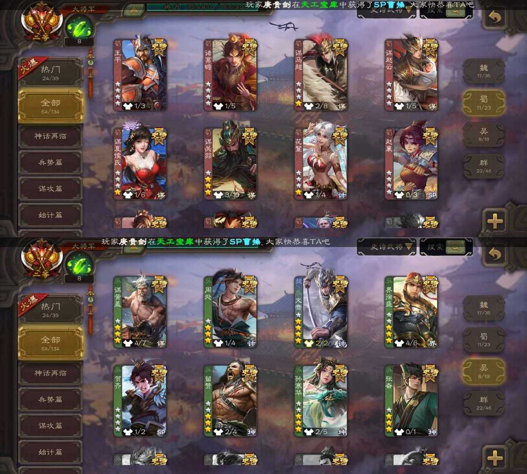 魏:双形态文鸯 界钟会 势董昭 界曹真 动态戏志才 动态清河公主 曹髦 双形态司马昭 蜀:诸葛瞻 谋马超 谋赵云 谋关羽 谯周 吴:谋黄盖 周处 界徐盛 张奋 动态孙寒华 群:谋张角 谋公孙瓒 动态杜预 张让 界李儒 卑弥呼 动态刘焉 南华老仙 神:神曹操 神吕布 神赵云 动态神司马懿 动态神甘宁 动态神郭嘉 动态神荀彧